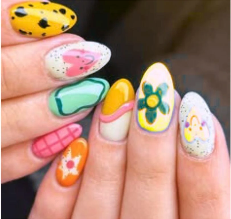 Why stick to one design when you have five fingers? Show your creativity with these mismatched nails on each finger. From hearts and stars to smileys and swirl anything goes. Yayyy!!!